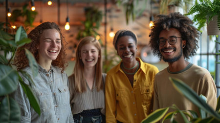 Diverse group of young professionals posing confidently in a modern office setting with greenery, during a sunny morning