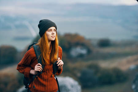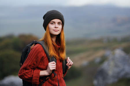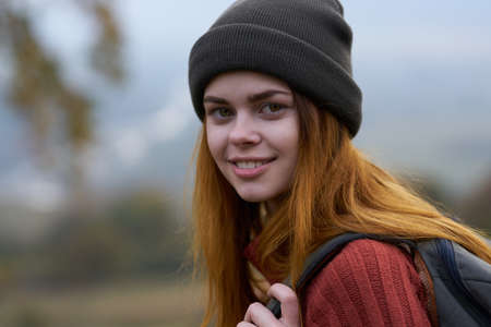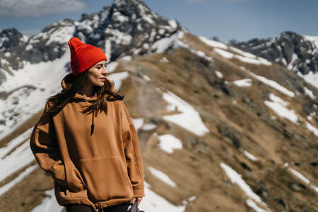 Beautiful young woman wearing knitted hat and casual clothes enjoying good weather in mountains.
