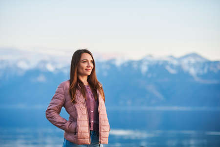 Young woman tourist in holiday, posing with the Swiss Alps behind her
