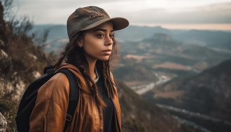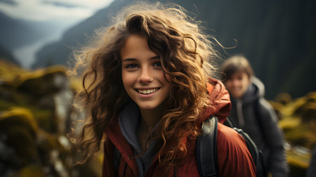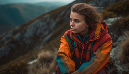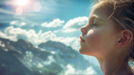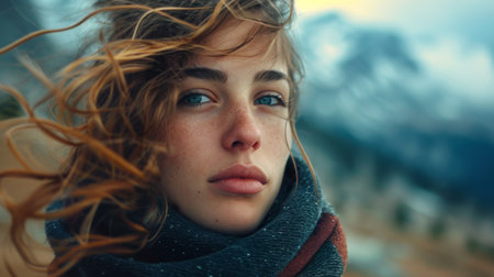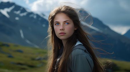 Realistic close-up photo concept of a girl in the mountains, wind tousling her hair while she gazes at the scenic landscape Generative AI
