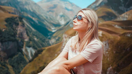 Woman hiking in mountains at sunny day time. View of Kazbegi, Georgia. Beautiful natural mountain background