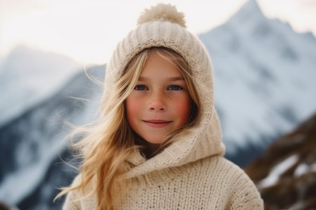 trendy little girl in warm stylish outfit smiling at camera with mountain backdrop, fashion, banner