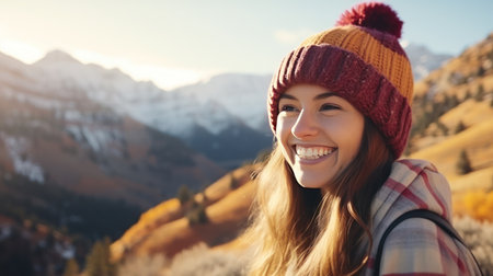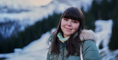 Smiling woman photo portrait, happy beautiful person outdoor, winter travel lifestyle, winter. mountains in the background. High quality photo