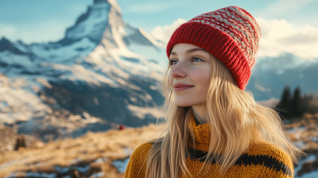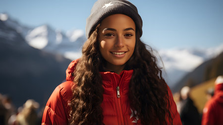 Portrait of a beautiful young woman with long curly hair, wearing a red jacket and a gray cap, standing against the backdrop of snowy mountains.