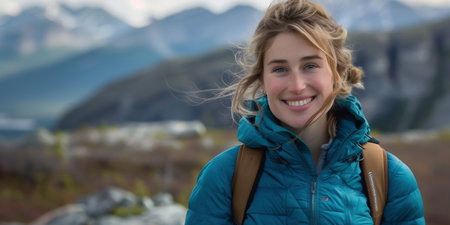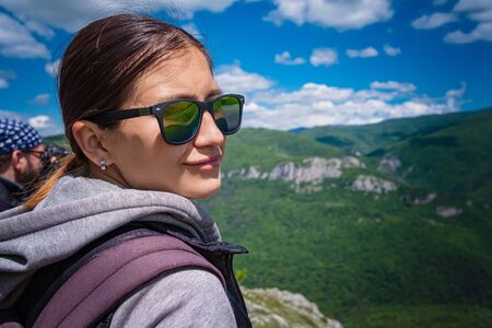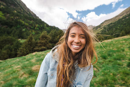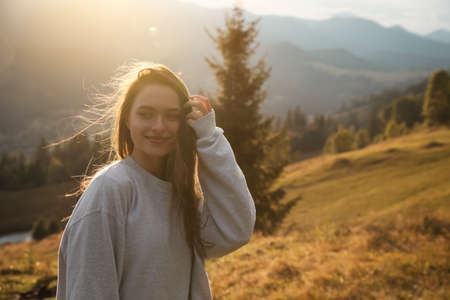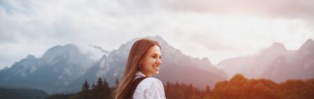 Outdoors portrait of young smiling traveler girl, on panoramic landscape background of mountains and sunlight through cloudy sky.