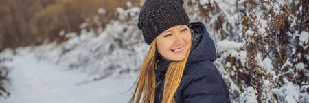 beautiful girl in a warm jacket and hat on the background of a winter forest