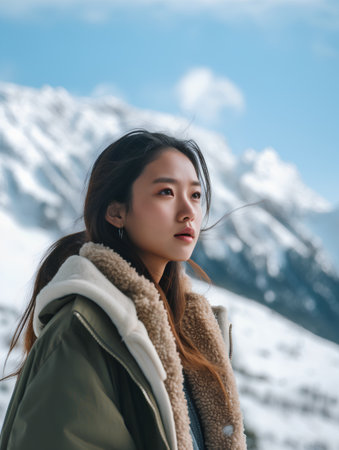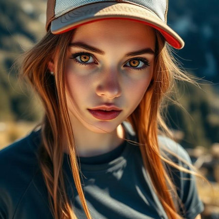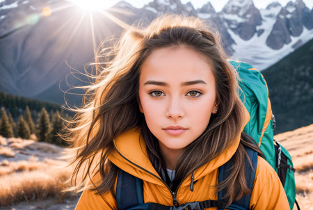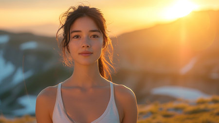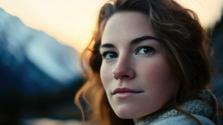 A young woman with windswept hair gazes into the camera, surrounded by breathtaking mountain peaks at sunset in a serene landscape