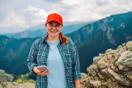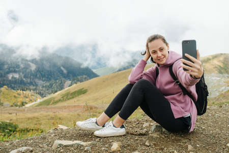 Shot of pretty young female tourist makes selfie in mountain. Woman traveler having active recreation in mountains. Travel, lifestyle, adventure, active vacations, outdoor photographing concept.