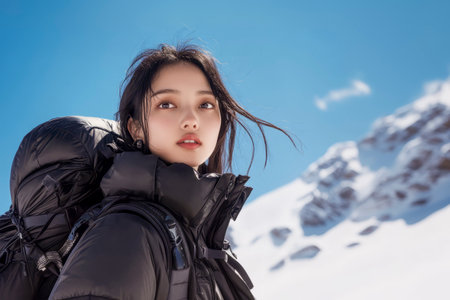 Female hiker wearing warm clothing and backpack enjoying breathtaking views of snow-capped mountains