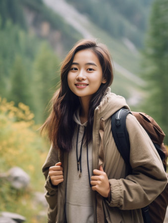 Cheerful young traveler Asian lady with backpack walking at the mountain lake. Korean teen girl enjoy her holidays adventure feeling happy freedom. Lifestyle travel and relax in free time concept.