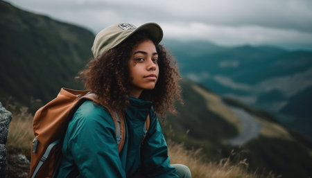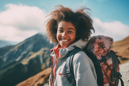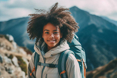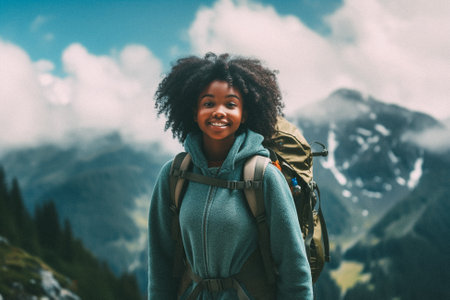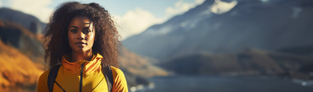 Beautiful african american woman with afro hairstyle looking at camera while hiking in mountains