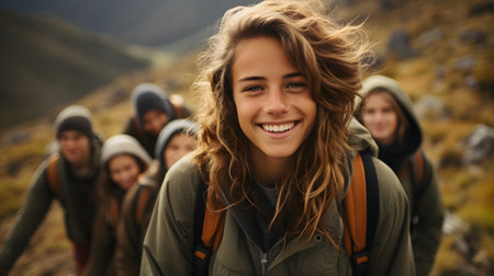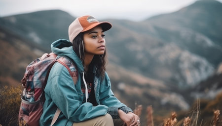Generative AI : Beautiful happy hiker woman taking a selfie hiking a mountain at vacation Girl wearing hat and backpack taking a self portrait smiling at the camera