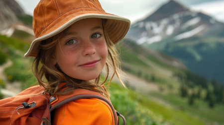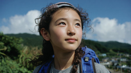 A young girl with curly hair looks upwards with a thoughtful expression. She is wearing a backpack and enjoying a sunny day while hiking on a mountain trail surrounded by lush greenery.