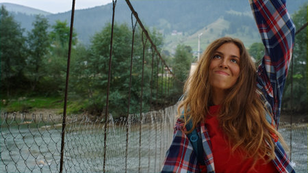 Positive hitchhiker enjoy dancing on mountain vacation. Happy woman moving hands on nature trip. Joyful girl wear travel clothes backpack outside. Smiling tourist have fun on holiday. Leisure concept