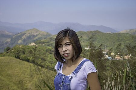 Portrait of Woman The background of mountains and sky at Nern Chang Suek hills, Kanchanaburi, Thailand