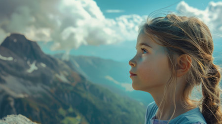 A young girl in contemplation, looking at a majestic mountain landscape under a clear blue sky. AIG50