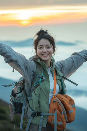 young happy and attractive Asian Japanese tourist woman hiking and enjoying beautiful mountain view during Summer holidays travel in travel and tourism concept