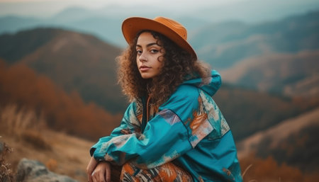 Portrait of a beautiful girl with curly hair in a hat on the background of mountains