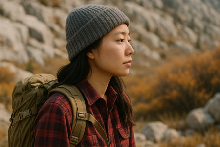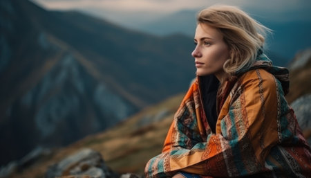 woman portrait mountains meadow landscape nature profile outdoors young female traveler in patterned jacket standing in alpine valley, contemplative and peaceful expression with distant peaks and