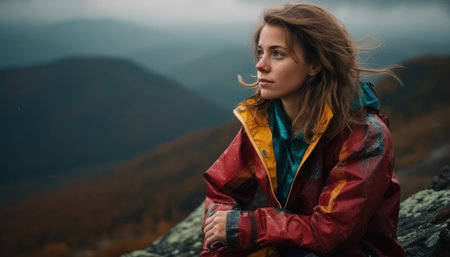 Portrait of a young woman in a raincoat sitting on a rock in the mountains