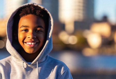 A young african american boy in a gray hoodie beams with joy against a blurred city backdrop at dusk.
