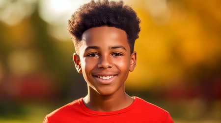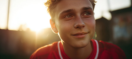 Close-up portrait of a young soccer player in a red jersey, smiling warmly with sunlight illuminating their face. Captured outdoors, showcasing cinematic emotional realism.