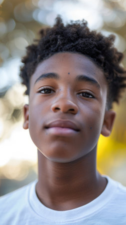 This image shows a young Black boy with short curly hair wearing a white t-shirt outdoors. He is looking directly at the camera with a serious expression. The image is captured in a shallow depth of field, with the boy in focus and the background blurred.