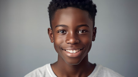 Minimal portrait of mixed-race teenage boy smiling at camera against white background, copy space