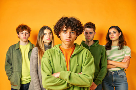 Portrait of a group of teenagers standing with crossed arms over yellow background