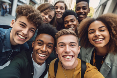 Global smiles: capturing joy in group selfies of cheerful and happy young people diverse nationalities, celebrating unity, friendship, cultural harmony in shared moments of happiness and togetherness