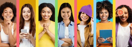 Collage of five diverse multi-ethnic women smiling, captured in individual portraits against bright blue, yellow, and orange backgrounds.