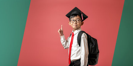 Cheerful Asian student in graduation cap and glasses pointing sideways on colorful background