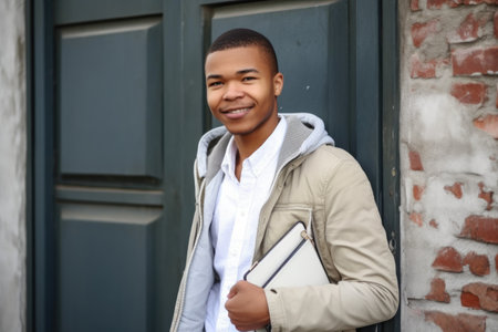 portrait of a happy young man standing outside with his laptop, created with generative ai