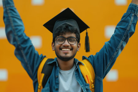 Happy indian male graduate against the background of university graduates. Generative Ai