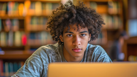 Concentrated College Student with Curly Hair in Library