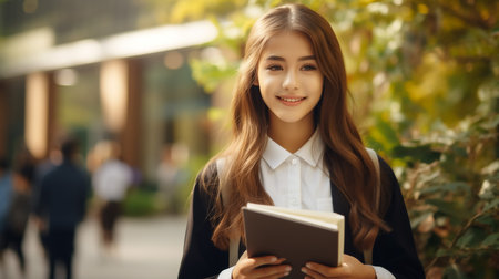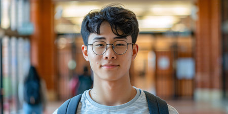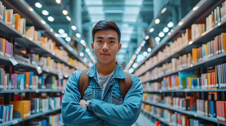 Confident Asian Teenager in the Library: Studious and Happy Learning Journey. Generative AI
