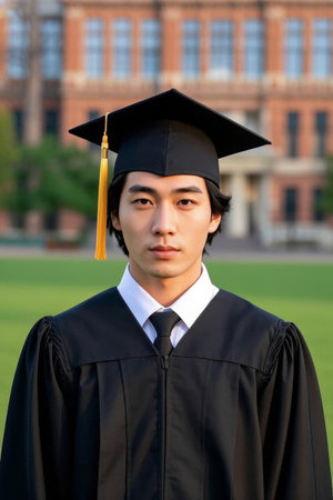 Portrait of young asian man with graduation cap in the city