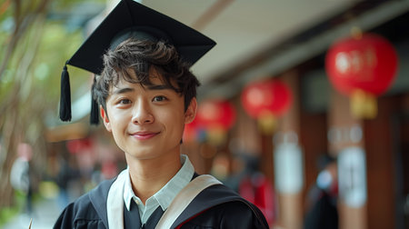 Smiling Young Graduate in Cap and Gown at a Ceremony With Red Lanterns