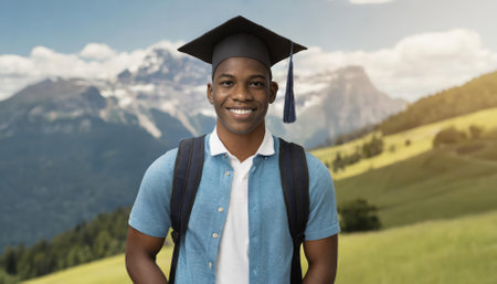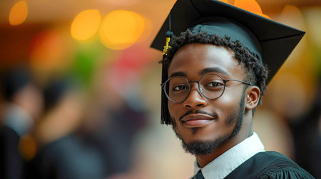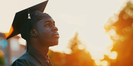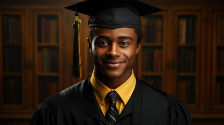 Triumphant milestone! Black college grad in cap and gown. Inspiring achievement captured. Celebrate success.