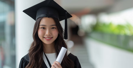 A young woman, dressed in a black graduation gown and cap, holds her diploma with a radiant smile. The background is blurred, suggesting a celebratory moment in a brightly lit hall.