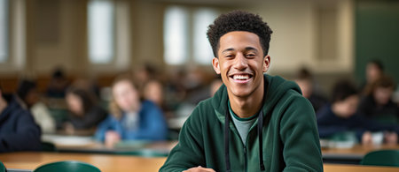 Portrait of a smiling young university male student in the classroom. Generative AI