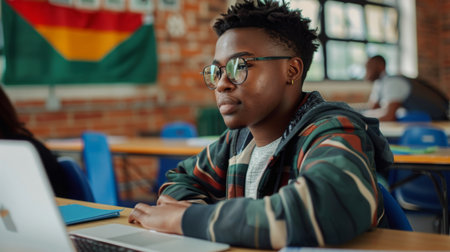 Student Engaged in Learning at Classroom Desk With Flag in Background
