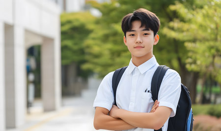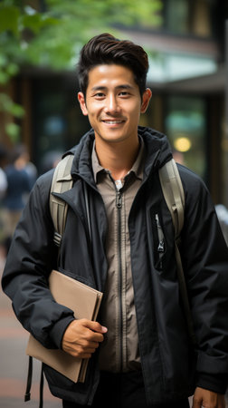 Portrait of young Asian student smiling at camera while standing in campus
