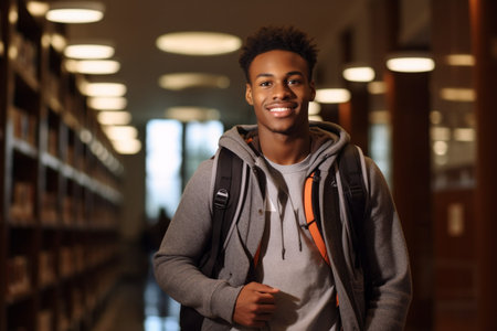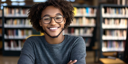 Confident Black University Student Studying in Library Surrounded by Books, Aiming for Success