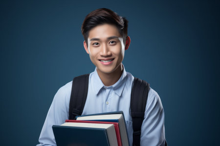 Confident young Asian male student smiling at the camera, holding textbooks and wearing a backpack, isolated on a blue background.
