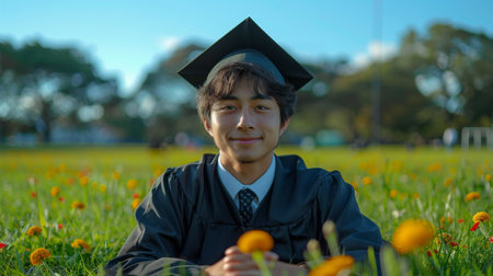 A young man in a black graduation cap and gown smiles for the camera while posing on a grassy field dotted with yellow flowers. He has dark hair and a tie and is looking directly at the viewer. The background is blurred with trees and a blue sky.