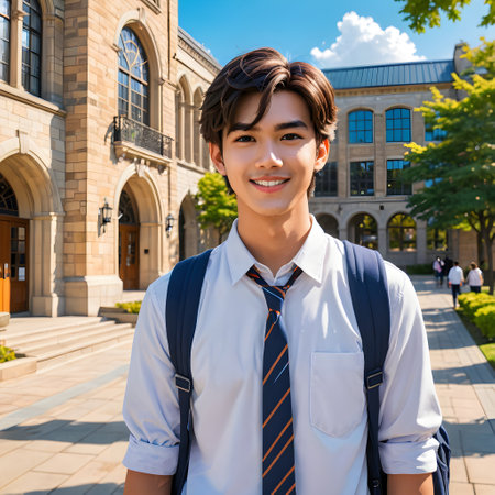 Smiling Male Student with a Backpack in a University Campus on a Sunny Day. High quality photo