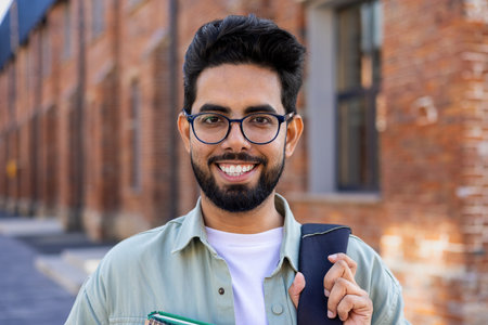 Portrait of young successful smiling student, Indian man close up smiling and looking at camera, man standing outside university campus in casual clothes with backpack and books in hands.