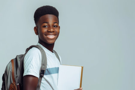 Studio portrait of a cheerful African American boy with a backpack standing isolated on a light background, gripping a textbook