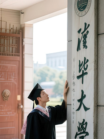Young man in graduation gown standing in front of the entrance of the university